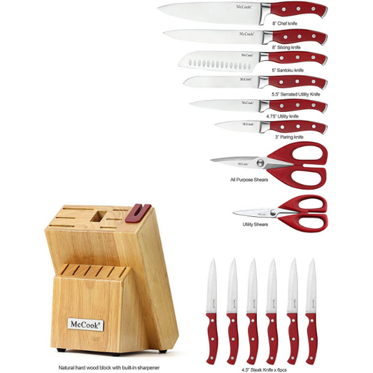 McCook® Stainless Steel Kitchen Knife Sets with Wooden Block, MC24 Kitchen Scissors and Built-in Sharpener, Red