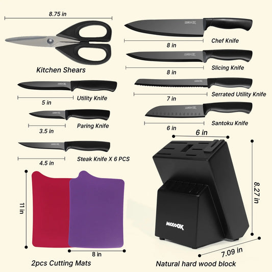 MoCook MO33W Kitchen Knife Set, 16 Pcs Knives Block Set with Built-in Sharpener, Healthy Anti-Rust Coating & German Stainless Steel Knife Set, Dishwasher Safe Beige